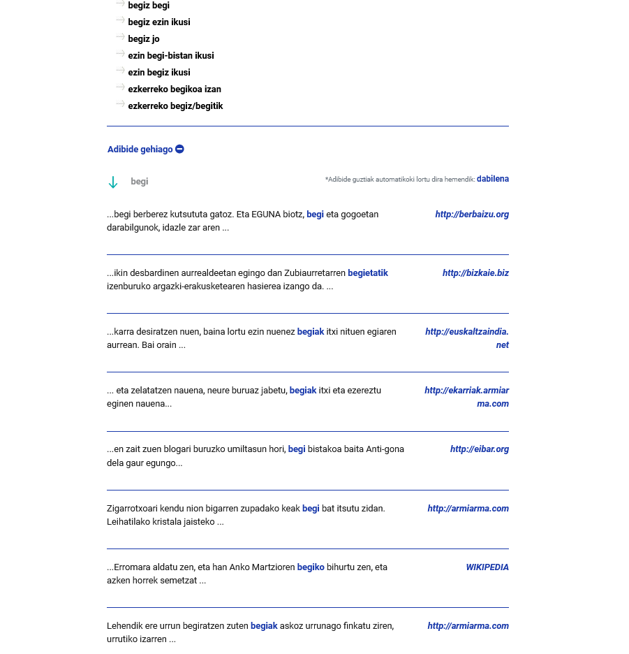Lehenik eta behin, hiztegi-sarreren adibideak aipatu nahi ditut. Aski agerian daude, sarrerari dagokion informazio-atalaren amaieran, eta gehienetan erraz ohartzen gara haietaz; halere, adiera, lexia eta lokuzioen zerrenda luzea bada, adibideak urruntxo azaltzen dira, eta ez gara haietaraino jaisten, batez ere gure kontsultaren erantzuna gorago aurkitu badugu. Bada, berba hauek irakurtzen ari zarela, hartu tarte bat eta bilatu begi hitza hiztegian. Euskara-gaztelania atalean, 12 adiera, 28 lexia eta 50 lokuzioren ondoren, hor behean adibideak ikusiko dituzu, guztiak ere Elhuyarren Dabilena web-corpusen ataritik ekarriak (hurrengo batean begiratuko diogu horri).