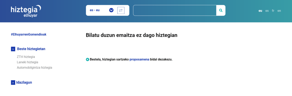 Beste hiztegi batzuetan bilatzeko funtzionalitatea sei hizkuntza-konbinazioetan dago erabilgarri: eu-es, eu-fr, eu-en, es-eu, fr-eu, en-eu.