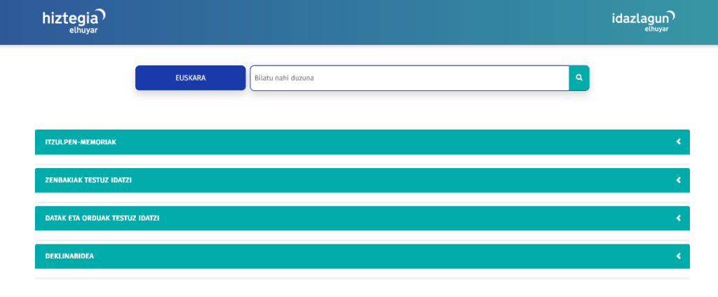 Gaurkoz, hortxe utziko ditugu adibideei buruzkoak. Zutabe berean, azken lerroan, Idazlagun dugu. Hor klik eginez gero, lau baliabide hauek erabili ahal izango dituzue: Itzulpen-memoriak, Zenbakiak testuz idatzi, Datak eta orduak testuz idatzi eta Deklinabidea.